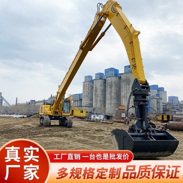 正是因為挖掘機的標(biāo)準(zhǔn)臂長度不能滿足某些工作場合,所以越來越多挖掘機都采用加長臂來填補這片空白,如深坑作業(yè)的地基工程,高空作業(yè)的樓房拆卸或河道清理等領(lǐng)域的建設(shè)和維護等,都必須用到加長臂才能高 效快捷地完成工程要求的各項指標(biāo)。城市的不斷擴張,老舊城區(qū)的拆遷。政府出于安全的考慮,對相對較低樓層不進行爆破拆除,而選擇了三段加長臂進行拆除。三段加長臂在原有的兩段加長臂的基礎(chǔ)上面加了一段中臂。中臂可以在很大的程度上面能夠保護司機的安全。三段式加長臂都是帶錘或者液壓剪進行工作。